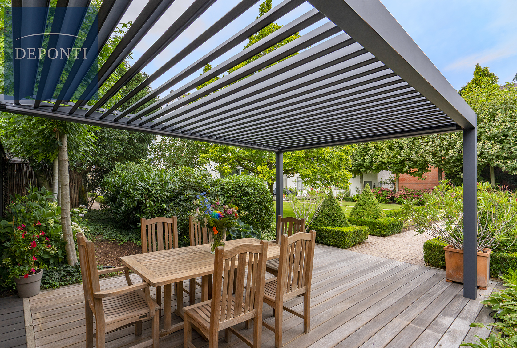 La pergola Pinela de Deponti est une pergola bioclimatique élégante en aluminium équipée de lames orientables permettant de contrôler la lumière, l’ombre et la ventilation selon vos besoins. Grâce à son design moderne et à sa construction robuste, la Pinela transforme votre terrasse en un véritable espace de vie extérieur utilisable toute l’année.